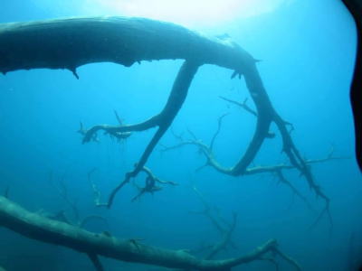| 世界文化遺産 富士山の麓、最も高い透明度を誇る本栖湖では、高所淡水ダイビングを楽しむことができます。「トンネル下」は溶岩帯のポイントで、トンネルを境に本栖湖の3要素ー溶岩・沈木・湧水の1つ、溶岩が水面から水深30mまで流れ込んでいるポイントです。 溶岩のくぼみにはスジエビ、ギギが生息、浅瀬はブラックバスやアユ、水底はカジカ、ヌマチチブなどが見られます。「ホーンテッドマンション」は迫力ある沈木を拝めることが出来るポイントで、10mを超す大きな木が、枝ごと付いた形で沈んでいます。枝に付いた藻がクモの巣のように見えて幻想的です。 |